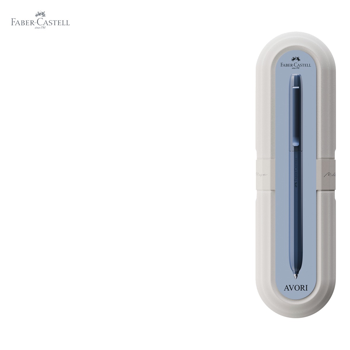 Pixul Faber-Castell Avori Midnight Muse bleumarin este realizat din 92% plastic reciclat, cu forma angulara ergonomica si mina albastra XB. Mecanism rotativ precis, clip metalic solid si ambalaj reciclat reutilizabil ca suport pentru instrumente de scris.