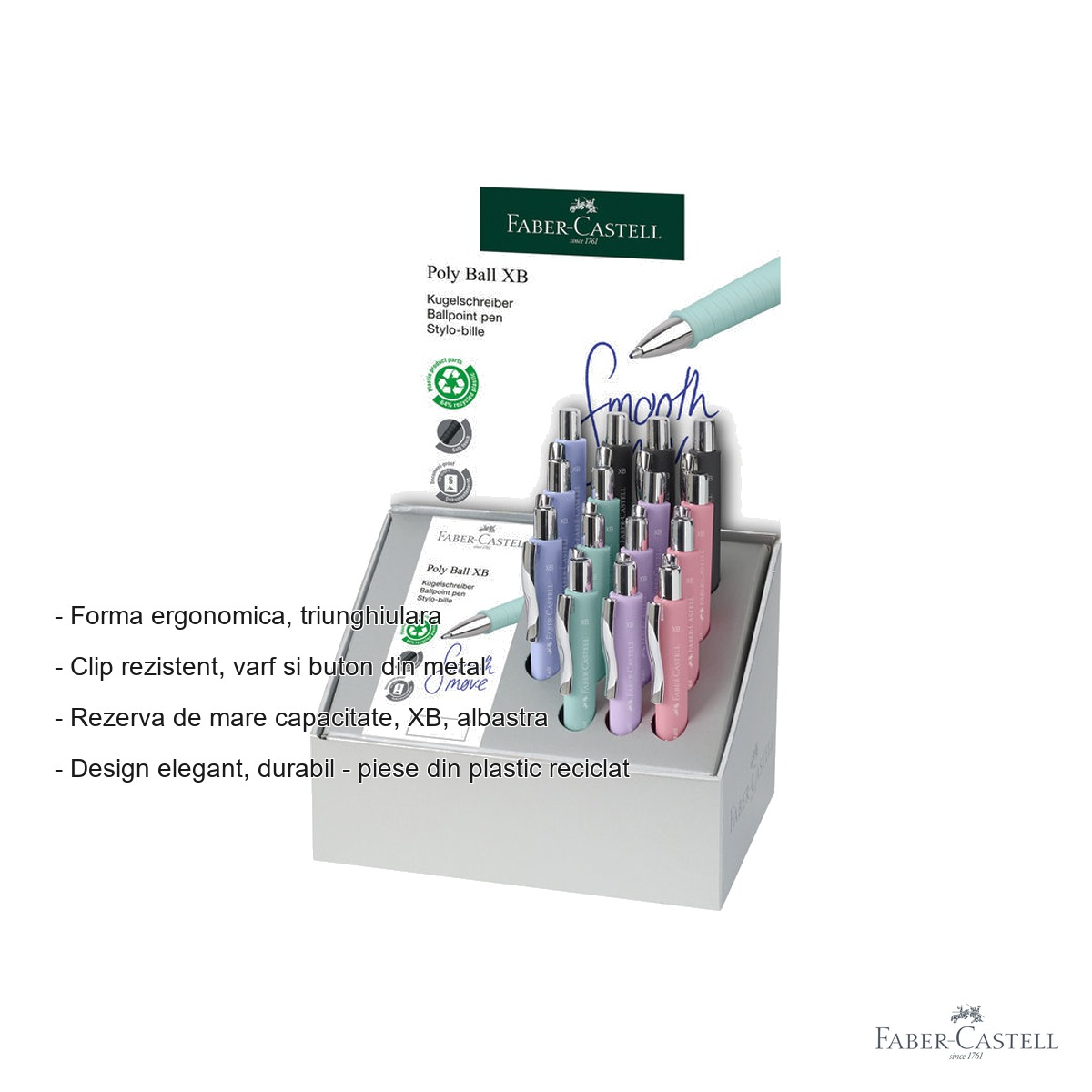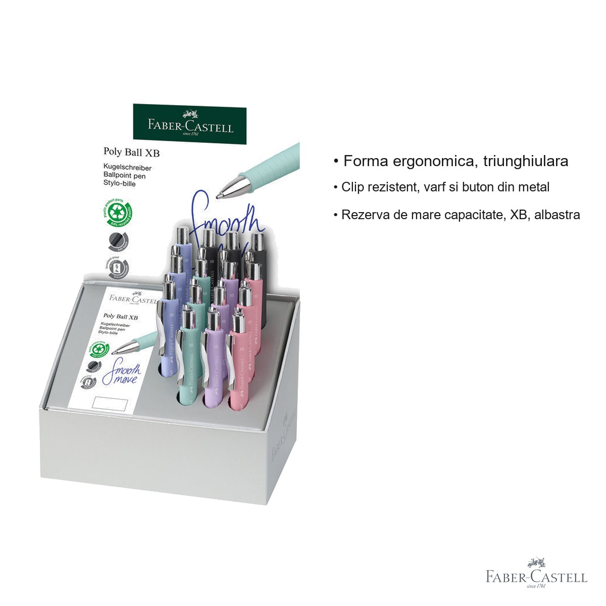 Pixurile Faber-Castell Poly Ball XB se remarca printr-o serie de avantaje clare fata de pixurile obisnuite. In primul rand, forma triunghiulara ergonomica asigura o prindere naturala si confortabila, reducand oboseala mainii chiar si dupa perioade lungi de scris. Grip-ul cu textura anti-alunecare ofera control maxim si siguranta in utilizare, indiferent de conditii. Varful si butonul din metal confera durabilitate sporita si o senzatie premium la utilizare, in timp ce clipul metalic rezistent permite atasarea pixului de buzunare, caiete sau agende fara riscul de rupere. Rezerva XB de mare capacitate garanteaza o autonomie excelenta, reducand frecventa inlocuirii acesteia si oferind un scris consistent si clar pe toata durata de viata a rezervei. Nu in ultimul rand, faptul ca piesele sunt confectionate din plastic reciclat face din aceste pixuri o alegere responsabila fata de mediu, in spiritul valorilor de sustenabilitate promovate de Faber-Castell.