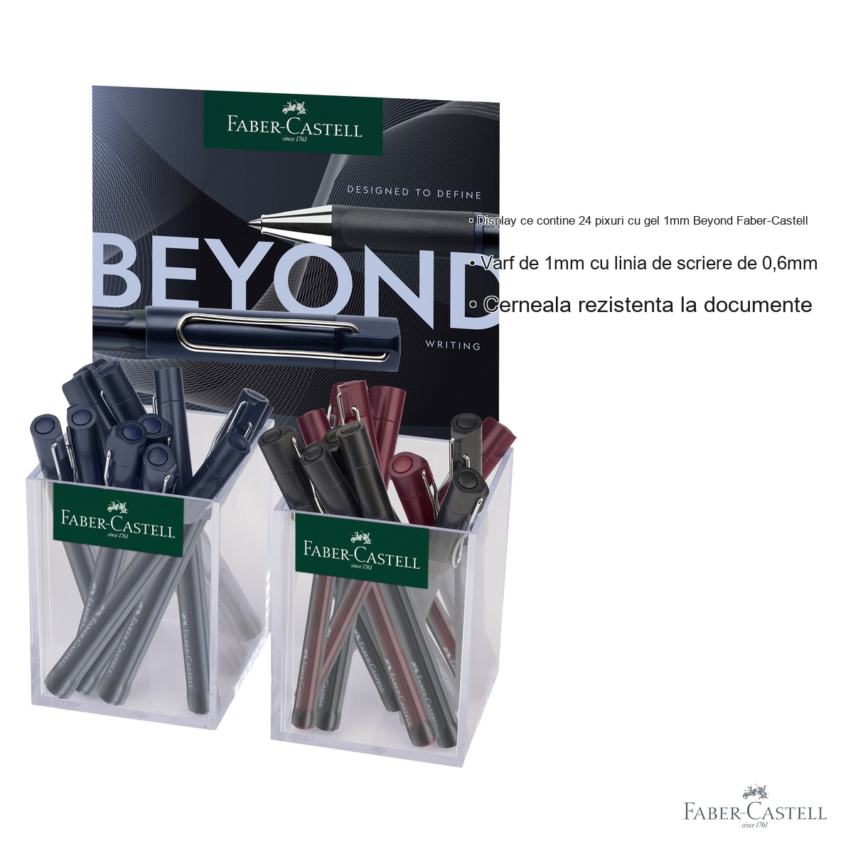 Atunci cand ai nevoie de pixuri cu gel de calitate superioara pentru birou, scoala sau uz zilnic, displayul Faber-Castell Beyond cu 24 de bucati este alegerea ideala. Pixurile cu gel ofera o scriere fluida si precisa, iar cerneala rezistenta la documente garanteaza ca insemnarile tale raman clare si durabile in timp. Fie ca semneaza documente importante, ia notite la birou sau scrie teme la scoala, aceste pixuri raspund nevoilor unui utilizator pretentios.