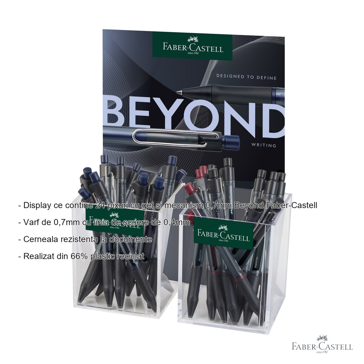 Fie ca esti student, profesionist la birou sau cadru didactic, un pix de calitate face diferenta in fiecare zi. Display-ul Faber-Castell Beyond cu 24 pixuri cu gel si mecanism reprezinta solutia completa pentru orice mediu de scriere. Combina performanta tehnica a unui varf precis de 0.7mm cu confortul unei zone de prindere cauciucate, oferind o experienta de scriere fluida si fara oboseala mainii. In plus, alegerea unui produs realizat din materiale reciclate este un pas responsabil pentru mediu.