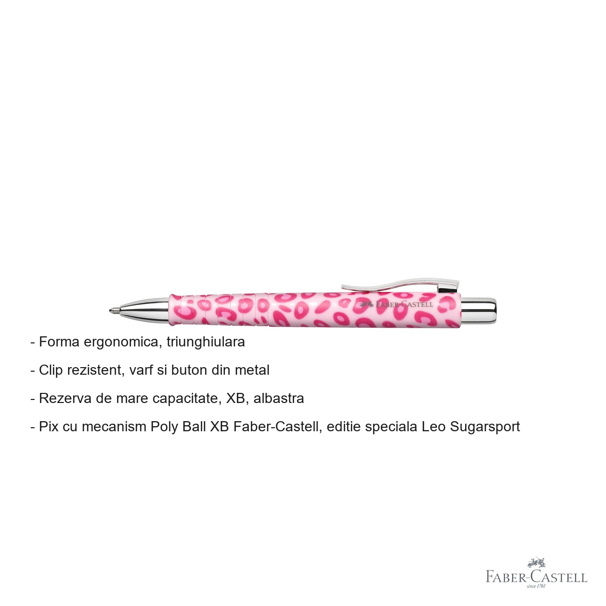 Pixul cu mecanism Faber-Castell Poly Ball XB din editia speciala Leo Sugarspots ofera o serie de avantaje clare pentru utilizatorul modern. Forma triunghiulara a corpului asigura o priza naturala si stabila, reducand oboseala degetelor si a mainii in timpul sesiunilor lungi de scriere. Grip-ul cu textura anti-alunecare imbunatateste controlul asupra instrumentului, prevenind alunecarile neplacute. Varful si butonul din metal adauga durabilitate si o senzatie premium la utilizare, in timp ce clipul rezistent permite atasarea pixului la buzunar, agenda sau caiet fara riscul de a se rupe sau deforma. Rezerva de mare capacitate cu varf XB (extra broad) garanteaza o linie de scriere vizibila, fluida si consistenta, ideala pentru cei care prefera o scriere mai pronuntata. Nu in ultimul rand, faptul ca 64% din componentele de plastic ale pixului sunt fabricate din plastic reciclat transforma aceasta achizitie intr-un gest responsabil fata de mediul inconjurator.