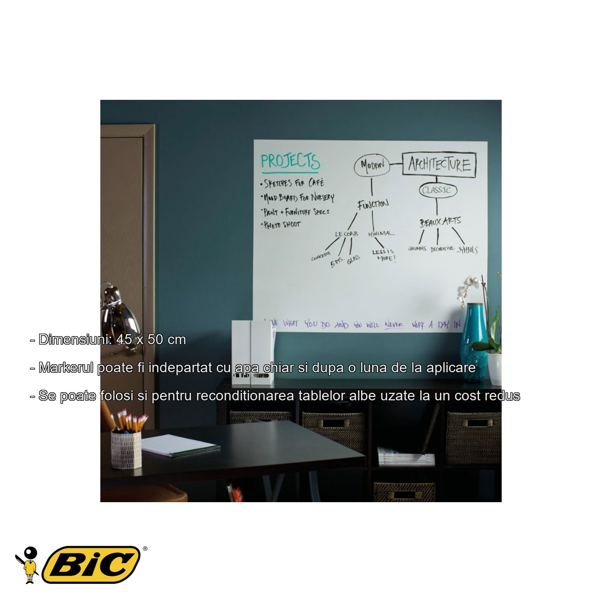 Unul dintre cele mai mari avantaje ale autocolantului tip tabla Bic Velleda este versatilitatea sa remarcabila. Spre deosebire de o tabla alba conventionala, care este fixa si grea, acest autocolant poate fi dus oriunde este nevoie, putand fi aplicat rapid pe orice suprafata neteda si rigida. Aderenta excelenta pe pereti, mobilier, lemn si sticla garanteaza ca autocolantul ramane ferm fixat pe durata utilizarii. Markerul nepermanent se sterge usor cu un burete uscat sau o laveta, iar in cazul in care scrierea a ramas mai mult timp pe suprafata, apa este suficienta pentru a indeparta marcajele chiar si dupa o luna. Aceasta proprietate elimina riscul de a ramane cu urme permanente pe suprafata, asigurand o utilizare indelungata fara degradarea aspectului. In plus, costul redus al acestui autocolant il face o alternativa extrem de accesibila fata de achizitia unei table albe noi, mai ales atunci cand este nevoie de o solutie temporara sau mobila.