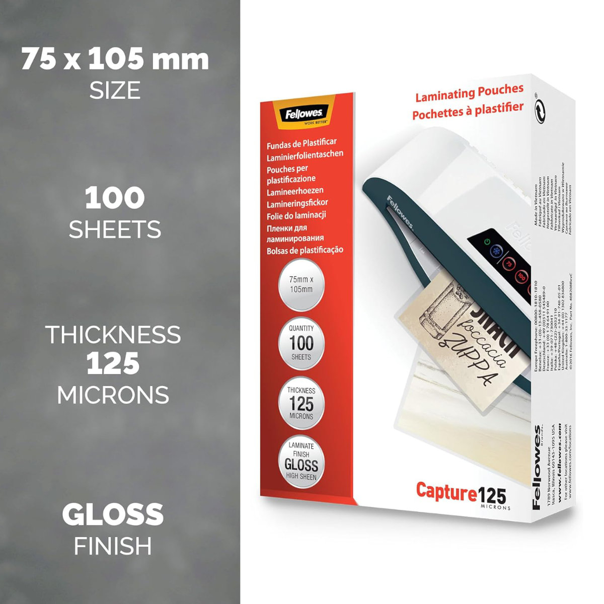 Fiecare fata a foliei are o grosime de 125 microni . Grosimea totala a documentului dupa laminare va fi de aproximativ 250 microni (2 x 125 microni) plus grosimea hartiei din interior .