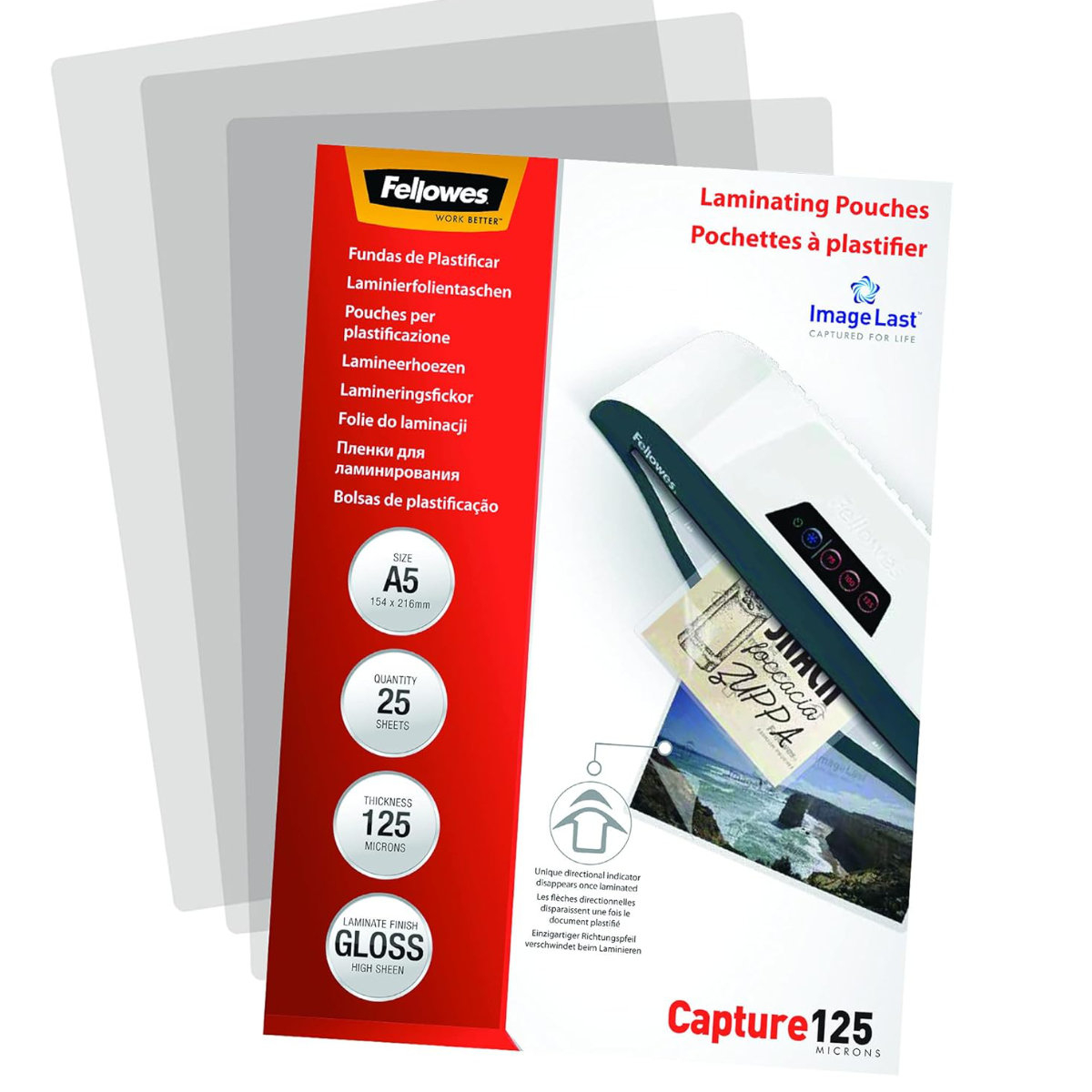 Set 100 folii laminare Fellowes ImageLast, format A5, 125 microni, finisaj lucios, pachet 100 bucati, cu indicator directional pentru utilizare corecta
