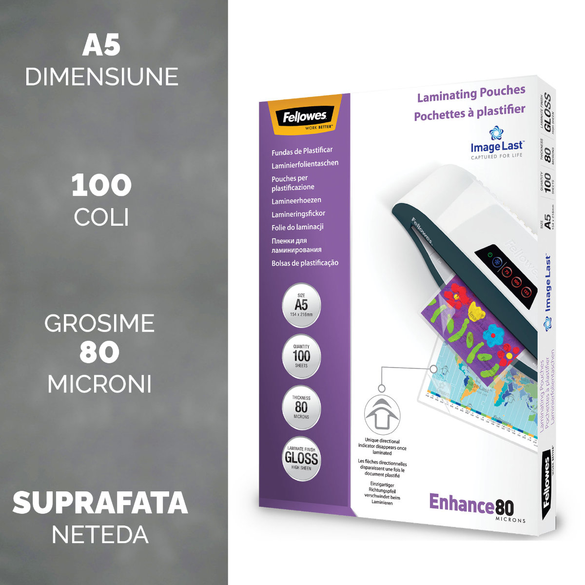 Set 100 folii laminare Fellowes ImageLast, format A5, 80 microni, finisaj lucios, pachet 100 bucati, cu indicator directional pentru utilizare corecta