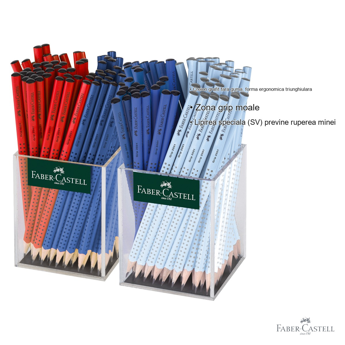 Display cu 144 creioane grafit fara guma Faber-Castell Grip 2001 in 3 culori (rosu, albastru, bleu). Forma triunghiulara ergonomica cu zona grip moale si mina B. Vopsea pe baza de apa, lipire speciala SV anti-rupere mina.