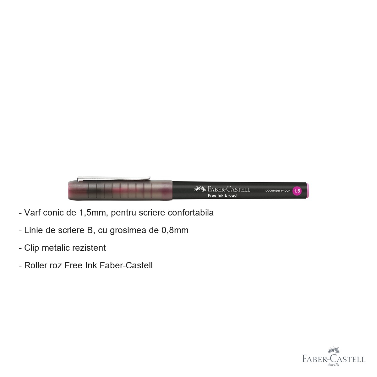 Atunci cand scriitura trebuie sa fie clara, fluida si placuta, alegerea instrumentului potrivit face toata diferenta. Rollerul Faber-Castell Free Ink roz este solutia ideala pentru cei care petrec ore intregi scriind la birou, la scoala sau acasa. Fie ca redactezi notite, completezi documente sau iti organizezi agenda, acest roller iti ofera o experienta de scriere confortabila, fara intreruperi si fara efort suplimentar din partea mainii. Combinatia dintre varful conic de 1,5mm si fluxul constant de cerneala garanteaza o linie uniforma si expresiva de fiecare data.