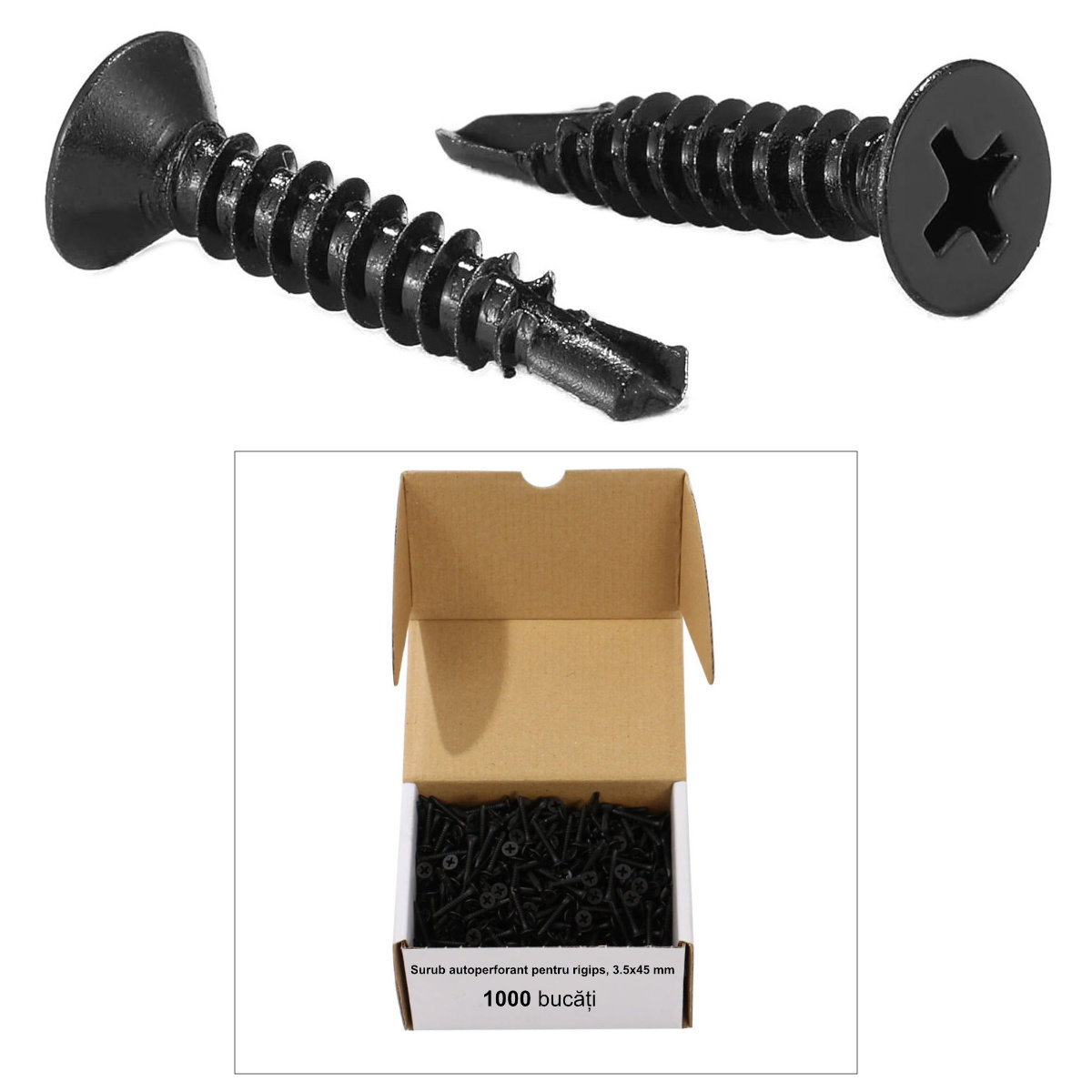 Cutie 1000 bucati Surub Autoperforant pentru Rigips, 3.5 x 45 mm, Cap Inecat, Otel Fosfatat, Lungime Extinsa, pentru Straturi Duble