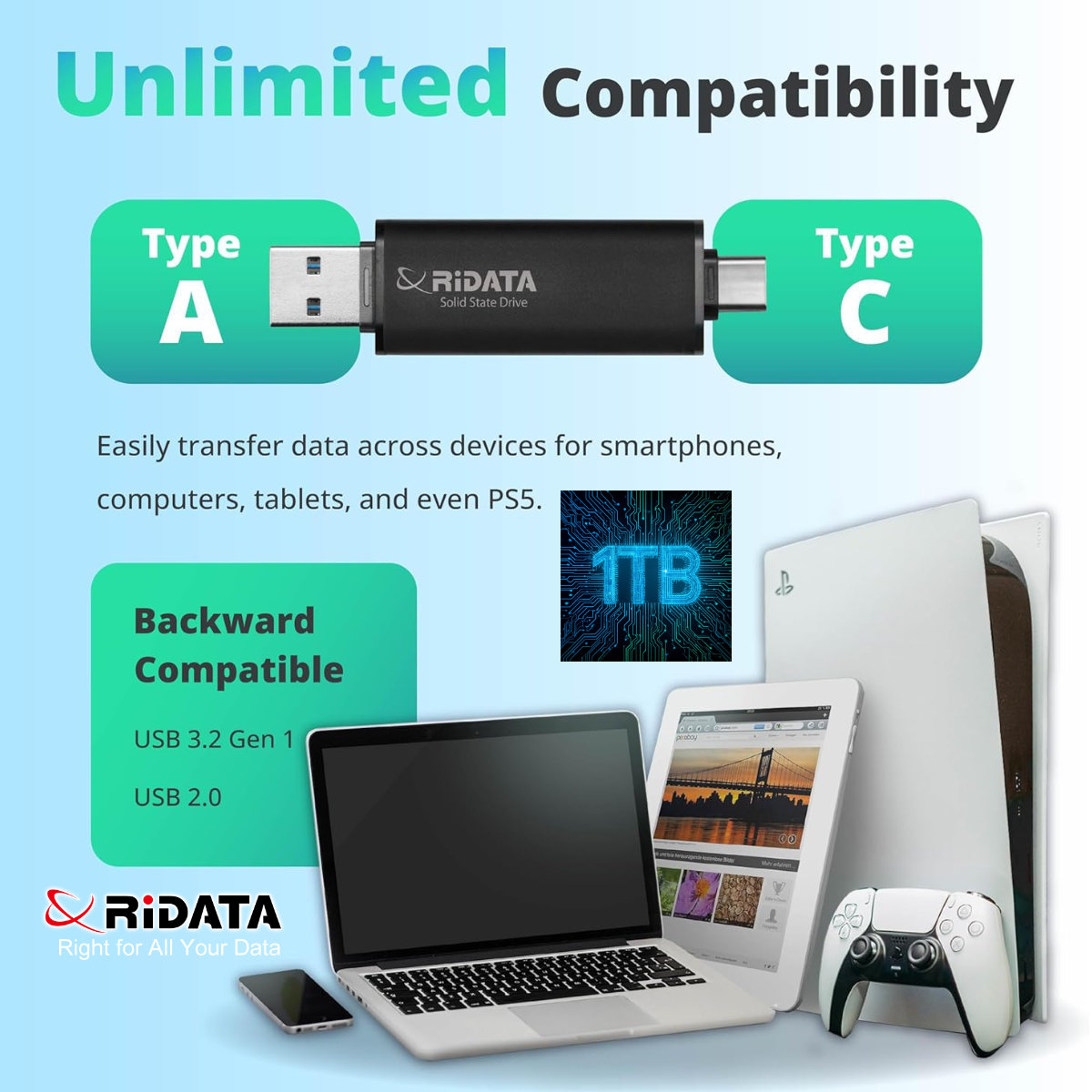 PlayStation 5 accepta SSD-uri externe USB pentru a rula jocuri PS4 sau pentru a stoca jocuri PS5 (dar nu pentru a rula jocuri PS5 direct de pe el). RIDATA UV903 este compatibil cu PS5 ca dispozitiv de stocare extern pentru aceste scopuri. Pentru SSD-ul intern de extindere, PS5 cere un model NVMe PCIe Gen4 specific.