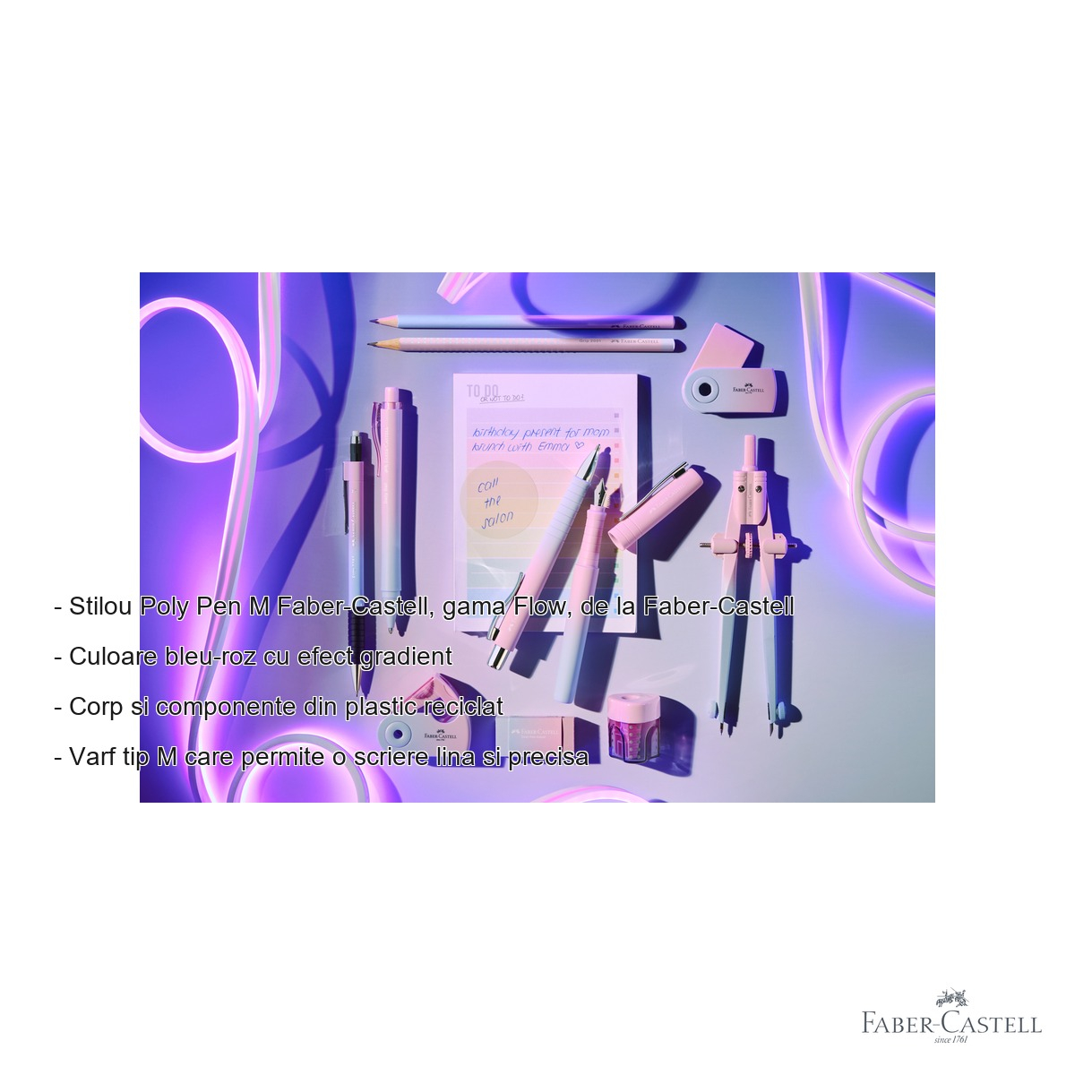 Stilou Faber-Castell Flow Poly Pen cu varf M din otel inoxidabil, corp bleu-roz cu efect gradient din plastic reciclat. Grip ergonomic anti-alunecare pentru o scriere comfortabila si precisa.