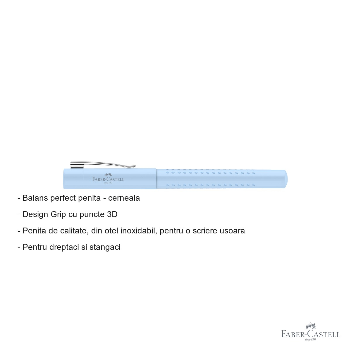 Stiloul Faber-Castell Grip 2010 Blue Sky a fost conceput pentru a oferi o experienta de scriere superioara in fiecare zi. Penita din otel inoxidabil garanteaza durabilitate si un flux constant de cerneala, fara intreruperi sau bavuri neplacute. Designul Grip cu puncte 3D este una dintre cele mai apreciate inovatii ale brandului, deoarece previne alunecarea degetelor si reduce oboseala mainii in timpul scrisului prelungit. Aceasta caracteristica este deosebit de valoroasa pentru elevii care scriu mult la scoala sau pentru profesionistii care redacteaza documente extinse.