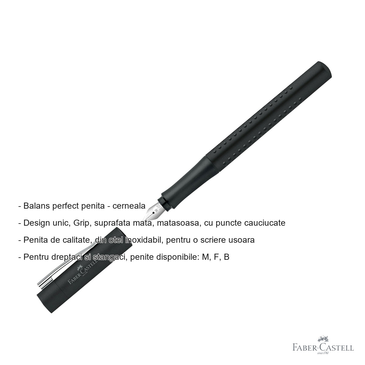 Stiloul Faber-Castell Grip 2011 negru se distinge printr-o serie de avantaje care il fac superior multor alte instrumente de scris din aceeasi categorie de pret. In primul rand, zona de prindere ergonomica, cu puncte cauciucate specifice gamei Grip, previne alunecarile si reduce presiunea exercitata pe degete, ceea ce il face ideal pentru cei care scriu mult si doresc sa evite oboseala. Suprafata mata si matasoasa a corpului confera un aspect premium si o senzatie placuta in mana. Penita din otel inoxidabil garanteaza o scriere fluida, fara intreruperi sau bale de cerneala, iar dimensiunea M (Medium) este cea mai populara alegere pentru uz general, asigurand un traseu vizibil si clar pe hartie. Clipul din metal robust permite atasarea stiloului de buzunarul caietului sau al agendei fara riscul de a se deteriora. Nu in ultimul rand, balansul perfect dintre penita si rezervorul de cerneala face ca scrisul sa fie natural si precis, indiferent de unghiul de tinere.