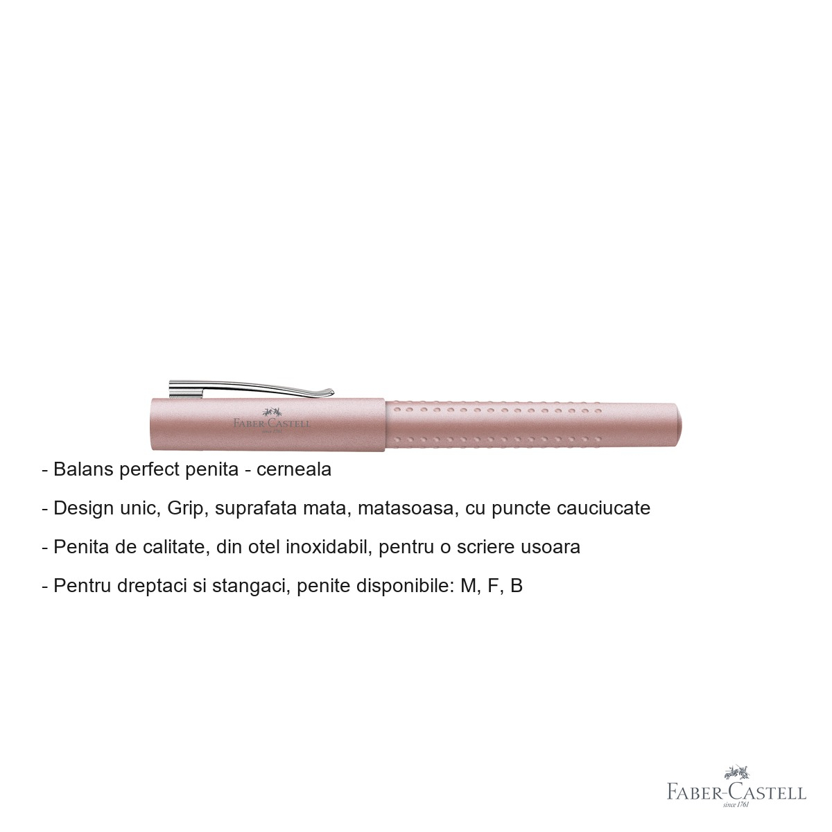 Stiloul Faber-Castell Grip 2011 Rose Pal este conceput pentru a raspunde nevoilor unui spectru larg de utilizatori. Zona de grip cu puncte cauciucate previne alunecarea degetelor si reduce oboseala mainii in timpul scrierii prelungite, asigurand un control optim al instrumentului. Penita din otel inoxidabil de tip B permite o scriere fluida, cu linii mai late, ideala pentru cei care prefera un scris cu personalitate. Corpul stiloului are o suprafata mata si matasoasa, placuta la atingere si eleganta in aspect, cu o nuanta de roz pal care adauga un element estetic deosebit. Clipul din metal robust asigura prinderea sigura de buzunar sau agenda, fara riscul de a se deteriora. Nu in ultimul rand, balansul perfect dintre penita si rezervorul de cerneala garanteaza o experienta de scriere echilibrata si naturala, fara efort.