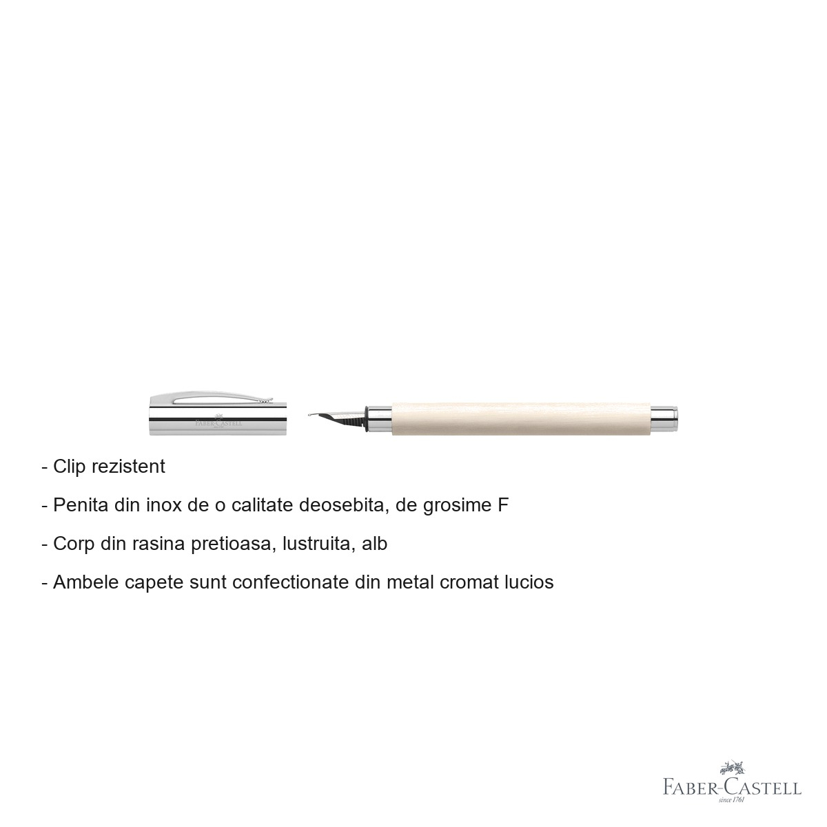 Stiloul Faber-Castell Ambition Precious Alb ofera o experienta de scriere superioara datorita mai multor factori distinctivi. In primul rand, corpul din rasina pretioasa lustruit confera o prizare confortabila in mana, reducand oboseala in sesiunile lungi de scris. Materialul este durabil si rezistent la uzura, pastrandu-si aspectul impecabil in timp. In al doilea rand, finisajele din metal cromat lucios aplicate atat pe capac cat si pe ambele capete ale corpului adauga un aspect luxos si profesional, facand stiloul potrivit atat in medii de afaceri formale, cat si ca accesoriu personal de tinuta. Penita din otel inoxidabil de calitate superioara garanteaza un flux uniform de cerneala si o scriere fina, cu trasaturi precise, specifica grosimii F. Compatibilitatea cu atat cartuse de cerneala standard cat si cu convertor (disponibil separat) ofera flexibilitate maxima utilizatorului, permitand alegerea intre confortul cartuselor de unica folosinta si economicitatea convertoarelor reutilizabile. Clipul rezistent asigura fixarea sigura a stiloului in buzunarul agendei sau al sacoului, prevenind pierderea sau deteriorarea accidentala.